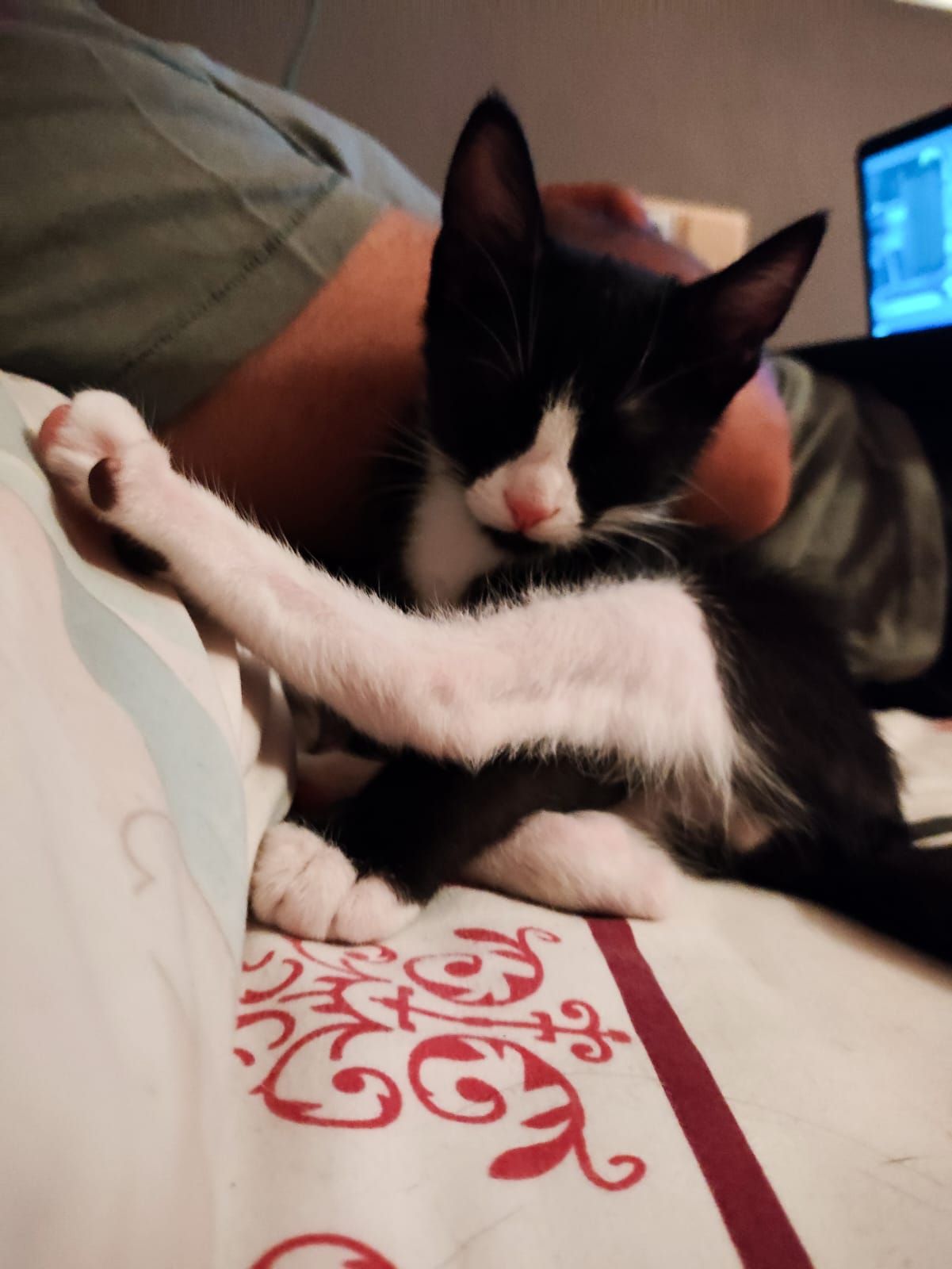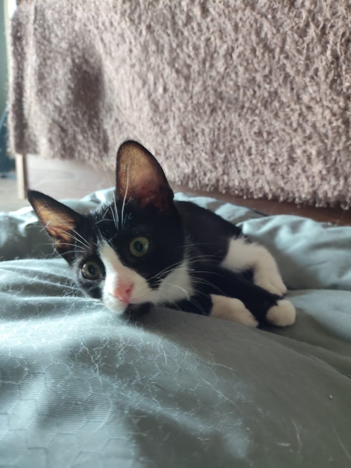 Er ist super unkompliziert, verschmust und alterstypisch verspielt. Er liebt es, in verrenkten Positionen zu schlafen.