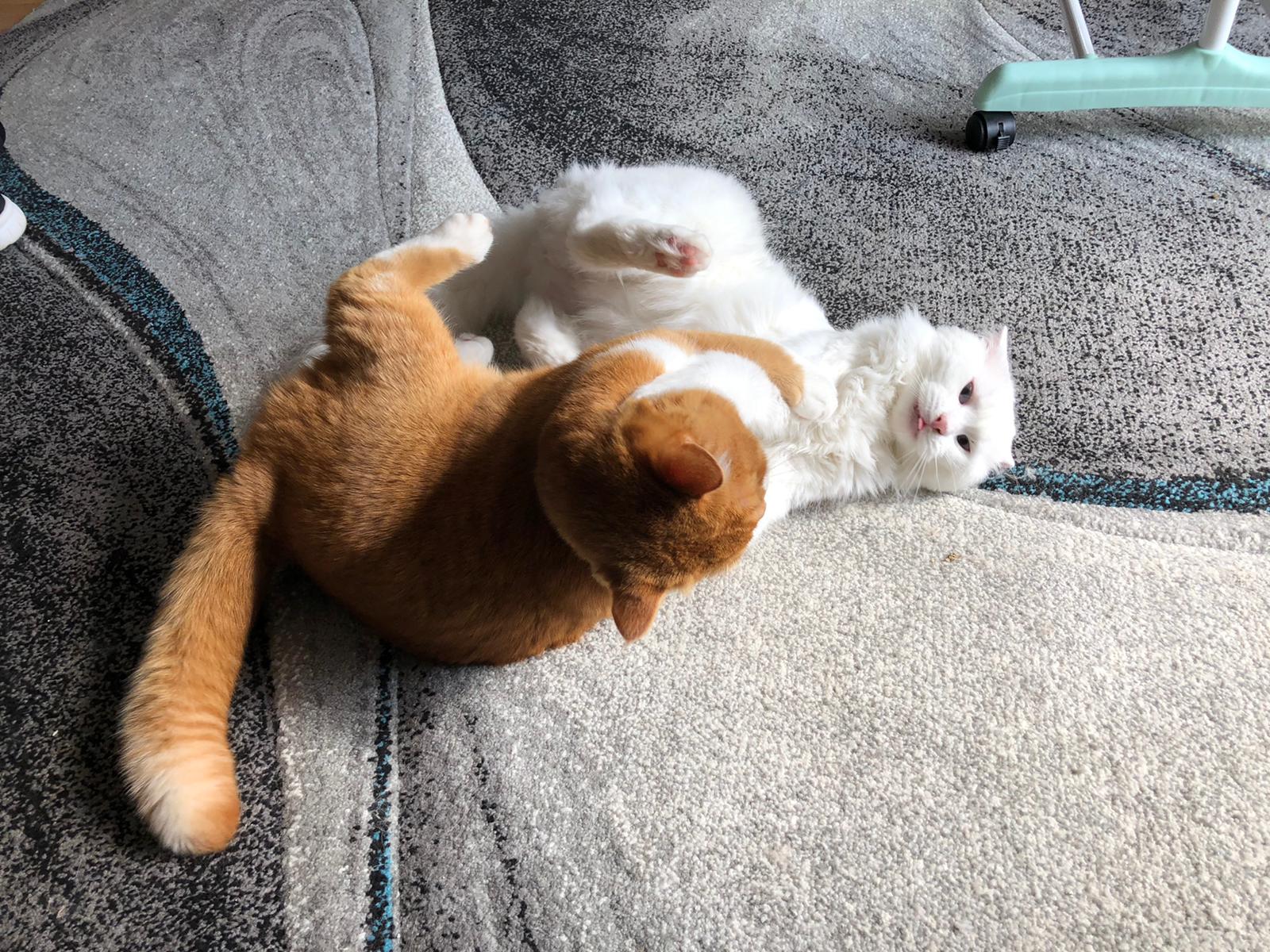 Inzwischen wissen wir, dass er einfach noch sehr viel zu lernen hatte, denn er hatte in seiner Vergangenheit nie andere Katzen um sich, sondern wuchs alleine in einer Box auf. Er konnte die "Katzensprache" nicht richtig. Es besserte sich, als ein weiterer Kater in seinem Alter einzog, mit dem er sein Bedürfnis nach Raufen und Jagen ausleben konnte 😻.