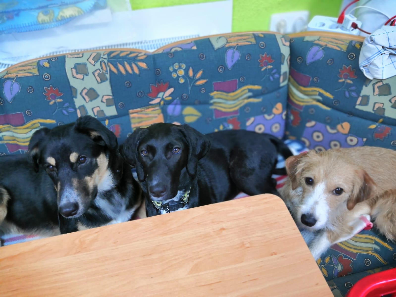So kamen wir zu unseren 3 Rackern. Sie lieben und bekriegen sich, sie halten zusammen wenn sie im Rudel Gassi gehen, da haben die Menschen am Ende der Leine keine Macht mehr. Nur getrennt (2 / 1) ist möglich. Zu hause waren sie auch ganz brav bis vor kurzem , seit gut 3 Wochen stellen sie immer mal wieder was an, letzteres war unser Polster auf der Eckbank. Das gab lauter kleine Fetzen das fanden die toll, ich weniger. So wie Mia meinte von heute auf morgen ich hab kein Bock mehr zu hören. Aber das gehört dazu, sie testen ihre Grenzen aus.